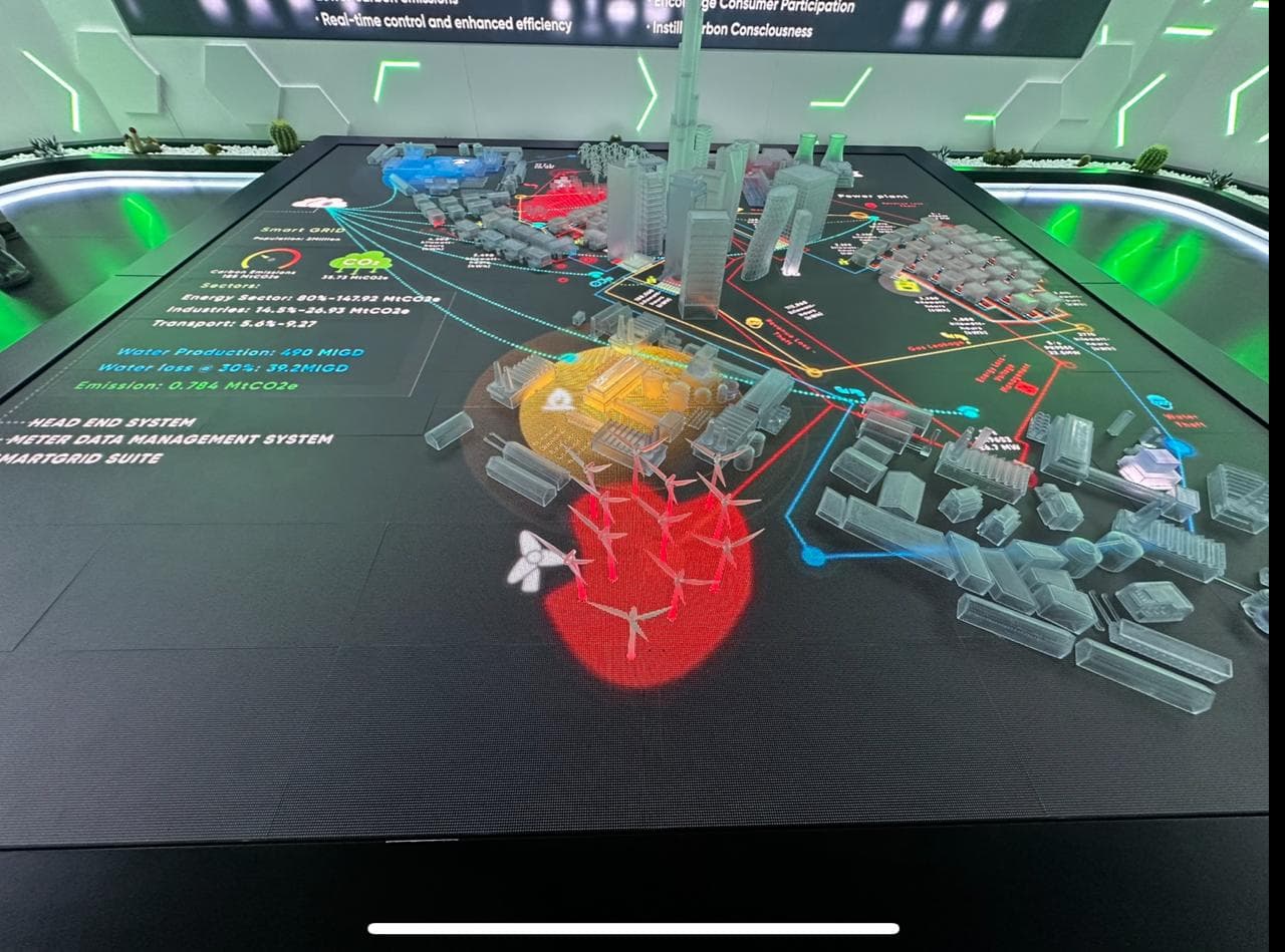 A translucent 3D-printed miniature city illuminated by a synchronized LED display, highlighting energy flow and grid efficiency