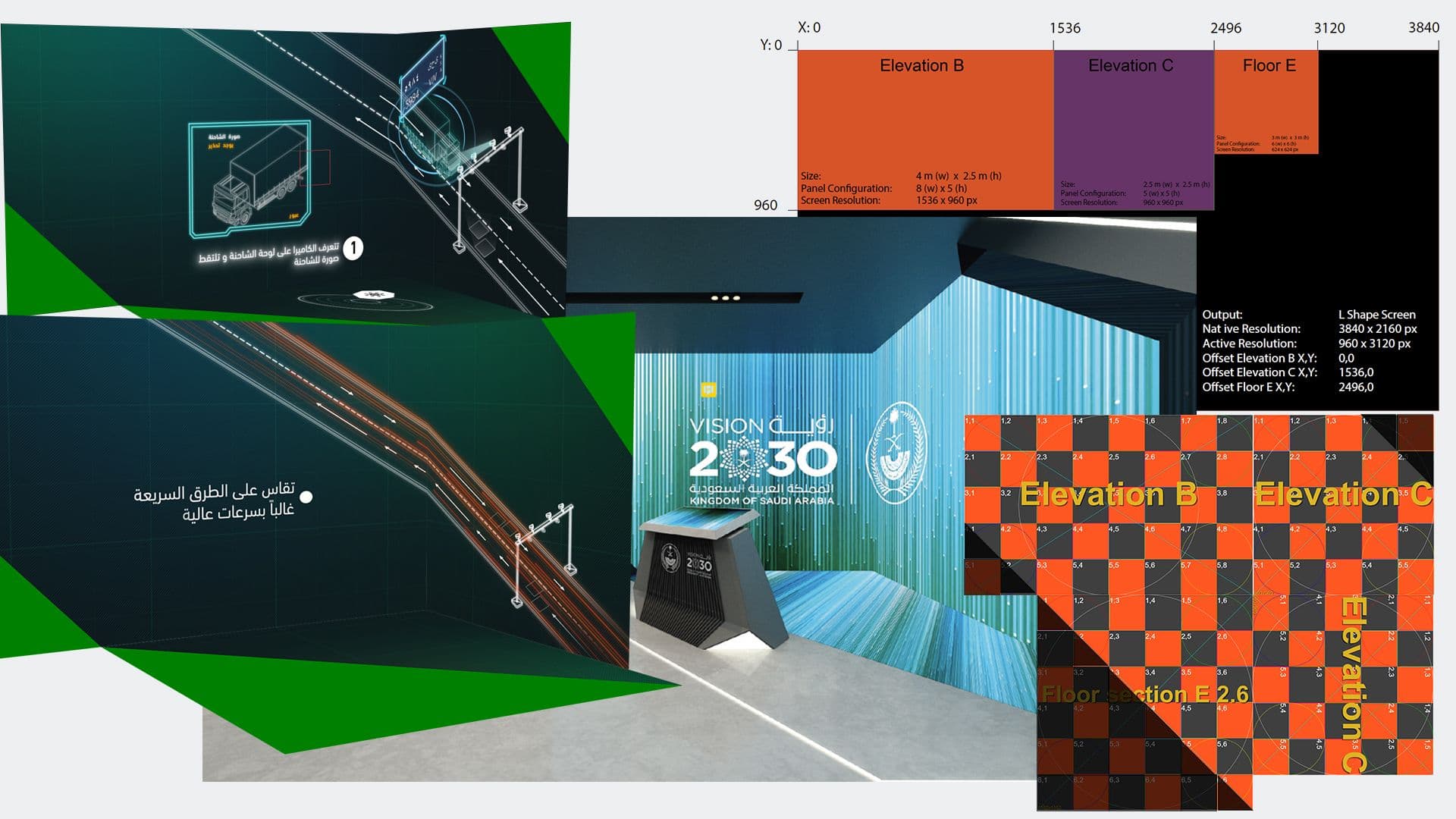 The Saudi Ministry of Transport pavilion at GITEX 2022 aimed to showcase its innovative smart gateway systems for commercial vehicles, designed to streamline road transport through advanced operational and electronic procedures. To bring this vision to life, our team developed an interactive L-shaped activation featuring a touchscreen interface that allowed visitors to explore the technology’s impact on smoother logistics and transportation efficiency. The unique display shape posed technical and design challenges, requiring meticulous content mapping to align with the structure.