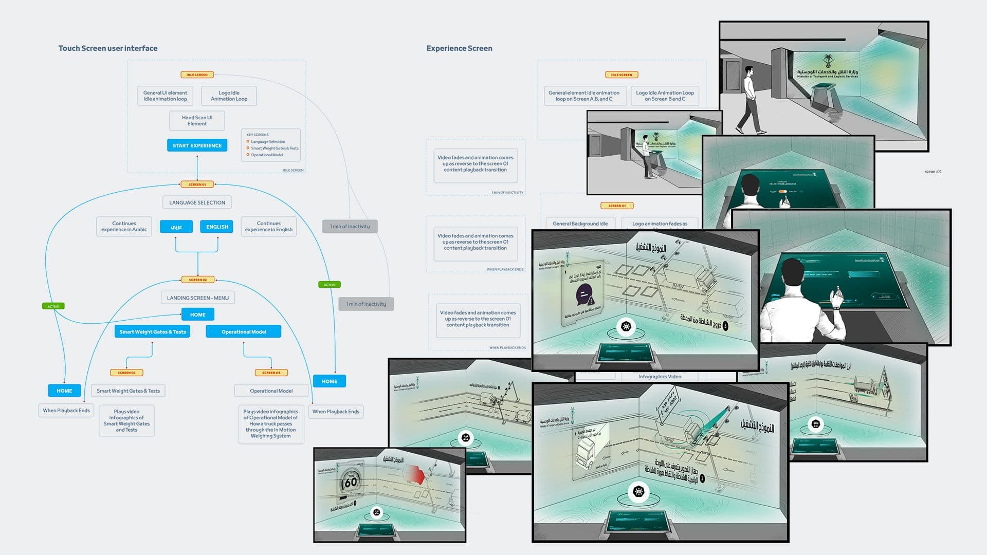Dynamic animations and 3D models illustrated the smart gateway’s workflow, from automated tolling to real-time traffic management, emphasizing efficiency gains for commercial transport. Outcome The activation successfully engaged GITEX 2022 attendees, offering a hands-on understanding of the Saudi Ministry of Transport’s advancements. The L-shaped display’s immersive design and intuitive controls highlighted the synergy between technology and infrastructure, aligning with the Ministry’s vision for smarter logistics.
